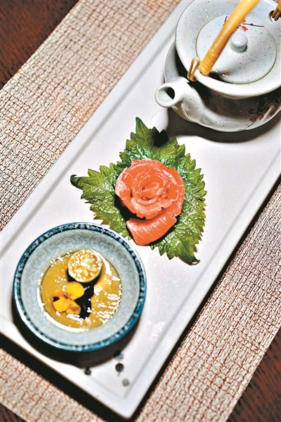 秋季渐凉,一碗暖汤沁心房。松茸亦是日本常食之物,Tommy用松茸配木鱼花、老鸡、瘦肉、鱿鱼干、虾和吞拿鱼鱼背肉,加百合、银杏、蛤蜊一起做汤,浓缩成精华。这汤颇有创意,装于功夫茶壶中,沏于浅杯内,杯中置小金橘片,一旁小碟放吞拿鱼,先饮一口汤,再夹吞拿鱼在汤中烫一下,表层微熟,里头软嫩,吃鱼再饮汤,味道又有别于前。日本人吃鱼,喜欢有所配搭。比如吃烤鱼配姜芽,吃寿司配寿司姜,刺身鱼则有时配芥末豉油有时配柠檬或者金橘,汤中会加柠檬以去腥。这也就是为什么师傅在汤碗之中放置了一片小金橘的缘由。(广州日报 全媒体记者曾繁莹)
