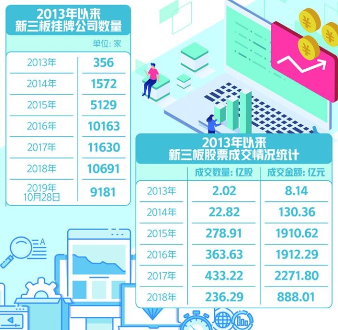 自2013年运营至2019年9月底,累计有13219家企业在新三板挂牌,其中中小企业占比94%,民营企业占比93%,6388家挂牌公司发行股票10516次,融资4911.39亿元。