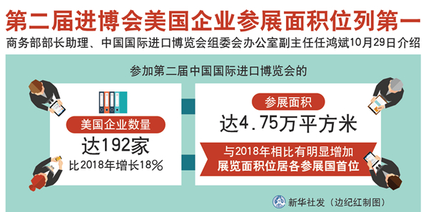 新华社北京10月29日电 记者陈炜伟 于佳欣 商务部部长助理、中国国际进口博览会组委会办公室副主任任鸿斌29日介绍,参加第二届中国国际进口博览会的美国企业数量达192家,比去年增长18%;参展面积达4.75万平方米,与去年相比有明显增加,展览面积位居各参展国首位。