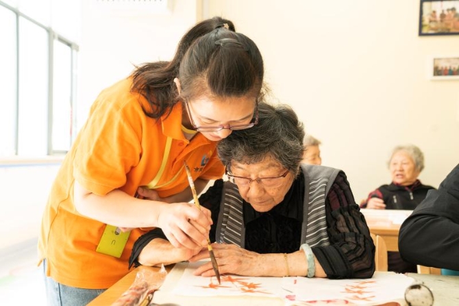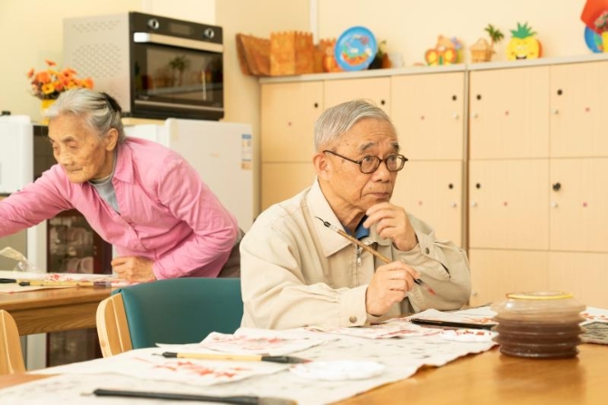 虹口区市民驿站托老所里,88岁老人朱德明一边画水墨画,一边感慨,“我越来越留恋这里了”;