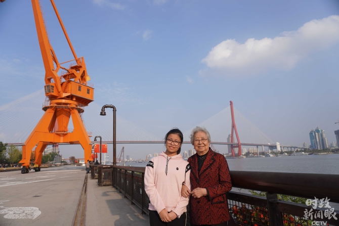 △当天,黄宝妹和16岁的曾孙女黄梦菡在杨浦滨江。(央视记者郭晓龙拍摄)