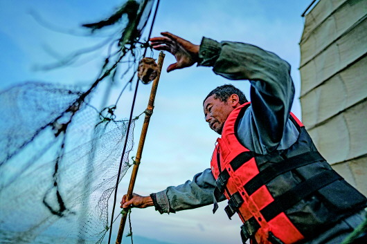 渔民张开弟在厨房里扒了两口饭,便与妻弟李培光急匆匆地赶往码头,开始一天的捕鱼劳作。