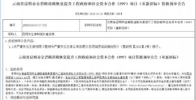 据了解,早在2016年10月市住房和城乡建设局曾发布《云南省昆明市金碧路道路恢复提升工程政府和社会资本合作(PPP)项目资格预审公告》,预计总投资58356.11万元。但后期因项目规划方案调整,于2017年4月27日发布了暂停公告,后又终止。