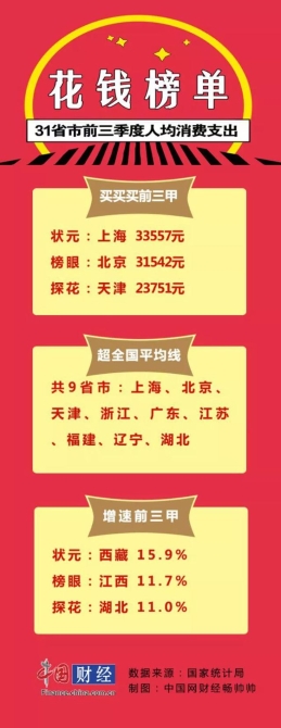 数据显示,北京、上海、天津、浙江、广东等9省市前三季度人均消费支出超过全国平均水平。上海居民最能花钱,人均达到33557元,北京、天津紧随其后,分别为31542元、23751元。