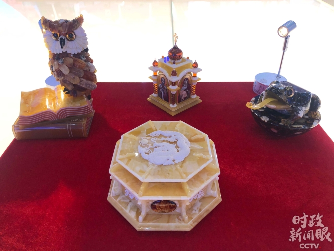 △俄罗斯馆里展出的工艺品。(央视记者鄂介甫拍摄)