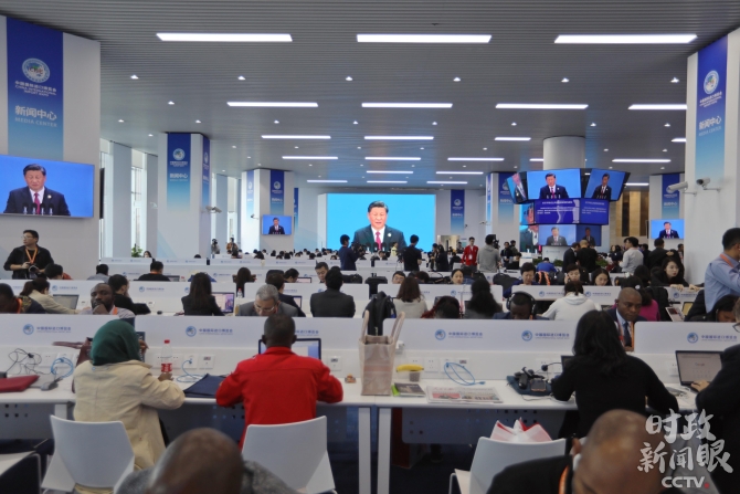 △各国记者正在新闻中心关注习主席的主旨演讲。(央视记者魏帮军拍摄)