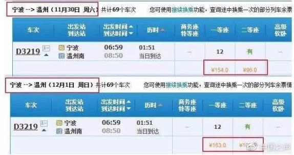 然而,票价也并不是都处于降价趋势,对于部分列车段而言,票价也出现了上升的情况。以宁波开往温州的G2343次列车为例,11月30日,该车的商务座288元,一等座154元,二等座96元;而12月1日,该车的票价商务座、一等座、二等座分别上涨17元、9元和6元,票价出现了小幅上涨。