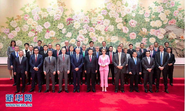 11月5日,第二届中国国际进口博览会在上海国家会展中心开幕。国家主席习近平出席开幕式并发表题为《开放合作 命运与共》的主旨演讲。这是开幕式前,习近平亲切会见世界500强企业家代表。 新华社记者李涛 摄