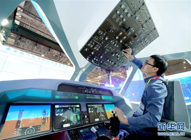 11月5日,工作人员在第二届进博会中国馆调试未来电气化飞机虚拟集成平台。 新华社记者 陈建力 摄