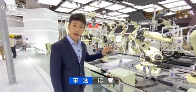 记者 宋达:我们看到的是日本品牌NACHI的18台汽车工业机器人。在后半部分的9台做的是点焊工作,前半部分的6台做的是组装工作。我们看到每一个机械臂都运转得非常灵活。今天在这儿我们只是看到个别工位的展示,实际上在日本的汽车生产线上,所有的工位是同时开工的,装配完一辆汽车仅需要52秒时间。