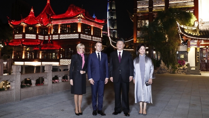 国家主席习近平和夫人彭丽媛5日晚在上海豫园会见法国总统马克龙和夫人布丽吉特。