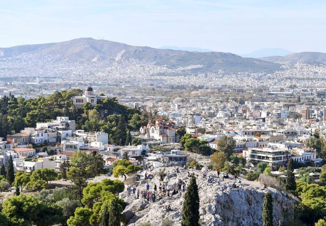 雅典。卫城脚下。希腊总统府、总理府附近街道已悬挂起两国国旗,迎接习主席来访。