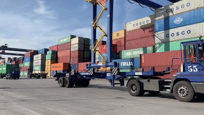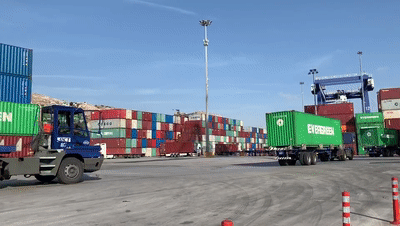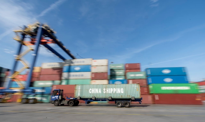 一辆辆集装箱式半挂车、码头叉车穿梭往来,有条不紊地装卸货物。现代化的比雷埃夫斯集装箱码头繁忙有序。