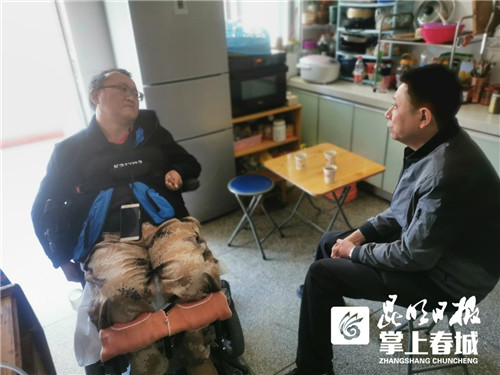 许文斌与伤残退役军人亲切交谈,询问了近期医疗和生活情况,并听取其家属对盘龙区退役军人事务工作的意见。决定帮助其解决购置特种轮椅费用3万余元,为其妻子进行就业岗位推荐。