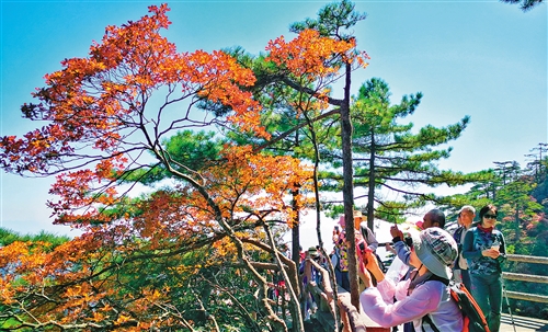 秋日的黄山色彩斑斓,青松与红叶辉映,引得游客纷纷驻足。 张涛摄(中经视觉)