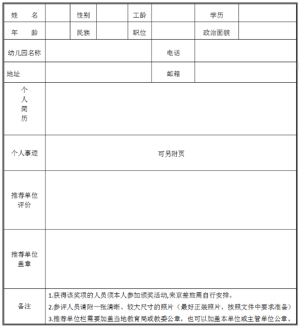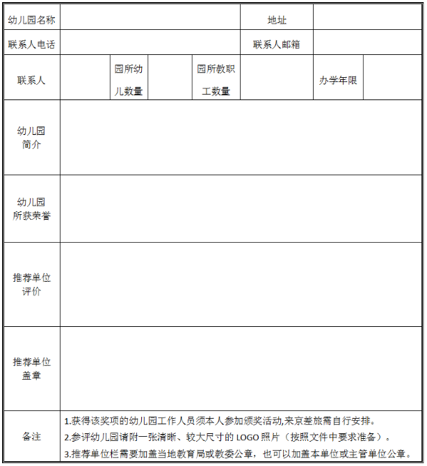1、参与活动的幼儿园或者幼教工作者可登录中国网教育频道学前栏目(中国网学前教育频道:xqjy.edu.china.com.cn),下载“幼教突出贡献人物”、“家长满意幼儿园”推荐表,并按照要求据实填写被推荐人的相关信息和事迹材料。事迹要客观真实,原则上不超过3000字(可以另附页)。每份推荐资料(园长/幼儿园)由以下六部分组成。A.被推荐幼教工作者需要提供个人简介与事迹材料1份(word版,3000字以内),个人照片1张(高清大图JPG版),裁好的标题图片1张(尺寸135x135,园长个人照片JPG版),推荐表2份(“附件一”的word版含表格填写内容1份不用签字盖章,pdf版需要有领导签字和加盖公章1份),幼教工作者所在单位的法定证书电子照片1张(企业需要提供营业执照副本复印件;民办非企业需要提供民办非企业登记证书;事业单位需要提供事业单位登记证书)。B.被推荐幼儿园需要提供幼儿园简介与事迹材料1份(word版,3000字以内),幼儿园logo1张(高清大图JPG版),裁好的标题图片一张(尺寸135x135,幼儿园logoJPG版),推荐表2份(“附件二”的word版含表格填写内容1份不用签字盖章,pdf版需要有领导签字和加盖公章1份),单位的法定证书电子照片1份(企业需要提供营业执照副本复印件;民办非企业需要提供民办非企业登记证书;事业单位需要提供事业单位登记证书)。