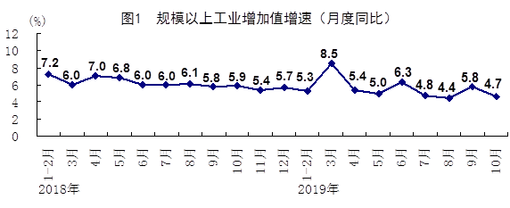 1-10月份,全国规模以上工业增加值增长5.6%,增速与1-9月份持平。10月份,全国规模以上工业增加值同比增长4.7%,增速比上月回落1.1个百分点。分经济类型看,国有控股企业增加值增长4.8%,股份制企业增长5.4%,外商及港澳台商投资企业增长2.1%。分三大门类看,采矿业增加值增长3.9%,制造业增长4.6%,电力、热力、燃气及水生产和供应业增长6.6%。高技术制造业增加值增长8.3%,比规模以上工业快3.6个百分点;其中医疗仪器设备及仪器仪表制造业、电子及通信设备制造业、医药制造业分别增长14.0%、8.5%和7.0%,比规模以上工业快9.3、3.8和2.3个百分点。光纤、太阳能电池、微型计算机设备产量分别增长59.4%、28.4%和9.4%。制造业采购经理指数(PMI)分项指数中,生产指数和供应商配送时间指数分别为50.8%和50.1%,均高于临界点。制造业生产经营活动预期指数为54.2%,位于较高景气区间。
