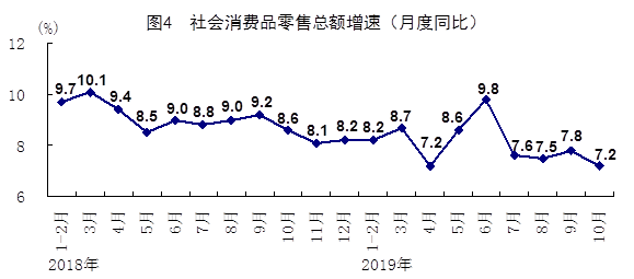 1-10月份,社会消费品零售总额334778亿元,增长8.1%,增速比1-9月份回落0.1个百分点。10月份,社会消费品零售总额38104亿元,同比增长7.2%,增速比上月回落0.6个百分点。其中,扣除汽车以外的社会消费品零售总额增长8.3%。按经营单位所在地分,城镇消费品零售额32744亿元,增长7.0%;乡村消费品零售额5360亿元,增长8.6%。按消费类型分,餐饮收入4367亿元,增长9.0%;商品零售33737亿元,增长7.0%。消费升级类商品较快增长。限额以上单位通讯器材类和体育娱乐用品类商品分别增长22.9%和11.5%,快于全部社会消费品零售总额增速15.7和4.3个百分点。国内旅游收入、全国电影票房总收入持续较快增长。
