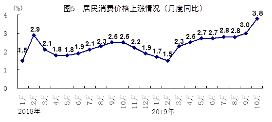 10月份,全国居民消费价格同比上涨3.8%,涨幅比上月扩大0.8个百分点,环比上涨0.9%。分类别看,食品烟酒价格同比上涨11.4%,衣着上涨1.2%,居住上涨0.5%,生活用品及服务上涨0.6%,交通和通信下降3.5%,教育文化和娱乐上涨1.9%,医疗保健上涨2.1%,其他用品和服务上涨5.5%。在食品烟酒价格中,粮食价格上涨0.5%,猪肉上涨101.3%,鲜菜下降10.2%,鲜果下降0.3%。扣除食品和能源价格后的核心CPI上涨1.5%,涨幅与上月持平。1-10月份,全国居民消费价格同比上涨2.6%。