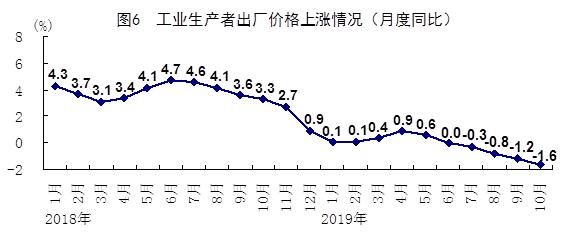 10月份,全国工业生产者出厂价格同比下降1.6%,环比上涨0.1%。工业生产者购进价格同比下降2.1%,环比上涨0.2%。1-10月份,工业生产者出厂价格同比下降0.2%,工业生产者购进价格下降0.5%。