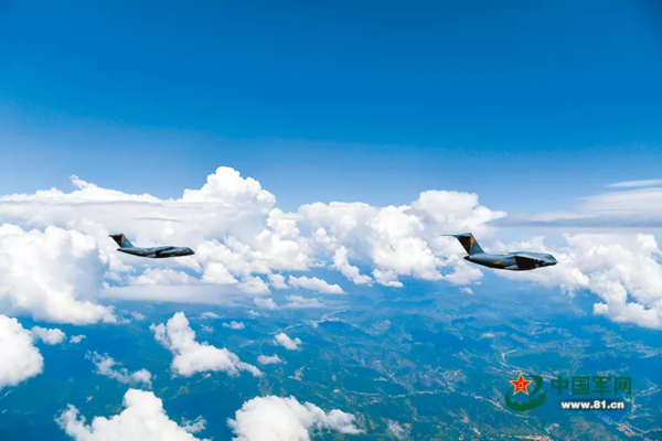 “鲲鹏”展翅,扶摇万里。图为国产大型运输机运-20展开飞行训练。叶贵童摄