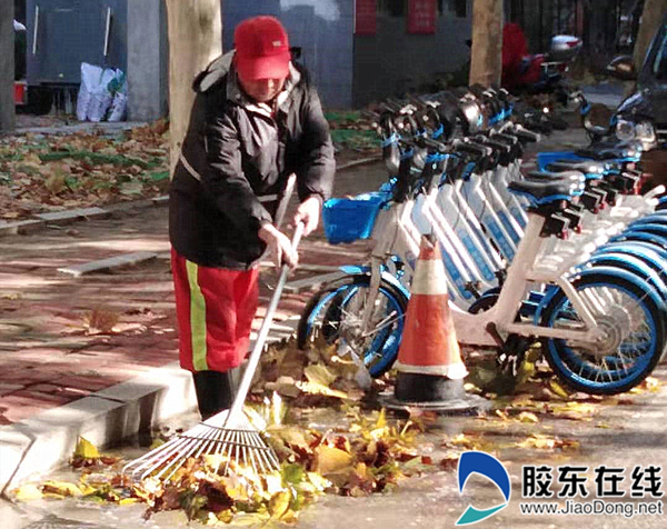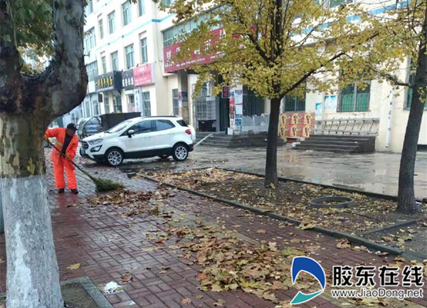 近日,受强冷空气影响,烟台市区普降阵雨,气温骤降8℃左右,短时风力达到6-7级,市区行道树的枯黄树叶明显增多,给环卫工人的清扫保洁增加了难度。