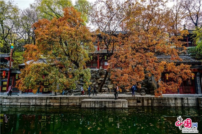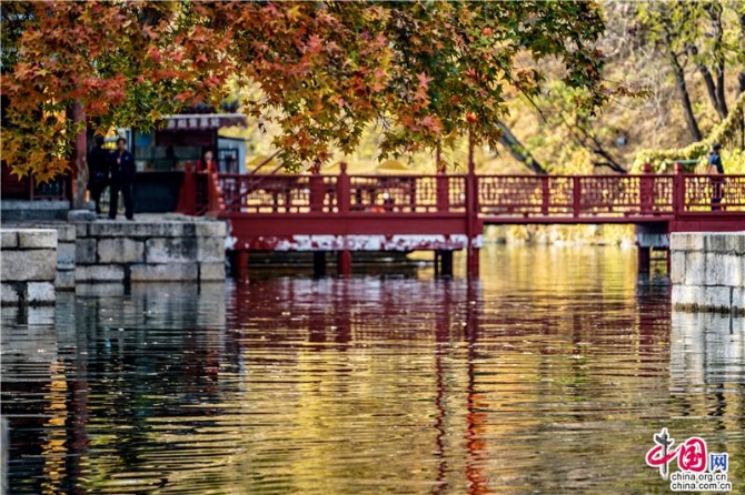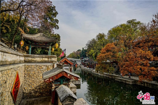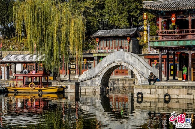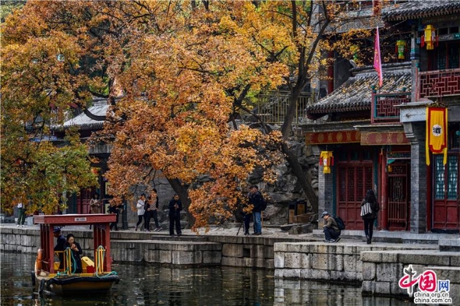 立冬后的京城,依然是深秋的景色一片,苏州街上几株枫树点燃了这条宁静的水街,游客三三两两穿梭在狭窄的岸边,河水轻漾,楼阁倒映,落叶沉浮,流水并不能倒流,时光更不能,当走过每一间店铺,看身着仿古服饰的店员,总有种穿越时空的错觉,画舫在水中晃晃悠悠,从街的这头到那头,一瞬间,似乎来到乾隆时代的京城江南岸。