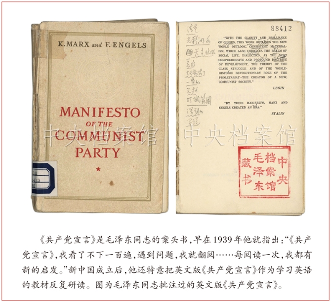 1919年底,青年毛泽东第二次来到北京,住了100多天。在此期间,有三本书特别地铭刻在他的心中,建立起他对马克思主义的信仰,第一本就是《共产党宣言》。后来在延安同美国记者埃德加·斯诺畅谈时,他这样回忆说:“我一旦接受了马克思主义是对历史的正确解释以后,我对马克思主义的信仰就没有动摇过。” 朱德同志从青年时期就开始读《共产党宣言》,1976年5月,90岁高龄的他,收到《共产党宣言》新译本后,即刻用一整天时间,对照新旧译文认真学习。一个多月后,朱德同志因病去世了。他活到老、学到老,始终把《共产党宣言》作为坚定马克思主义信仰、共产主义信念的精神支柱。