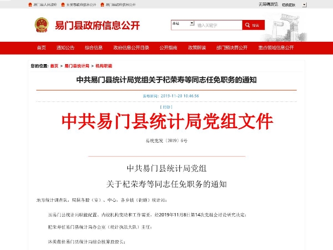 昆明信息港讯 机器人小明 11月18日,中共易门县统计局党组发布14名干部任免职通知。其中杞荣寿任易门县统计局办公室(统计执法大队)主任,沐美莲任易门县统计局综合核算股股长。详情如下: