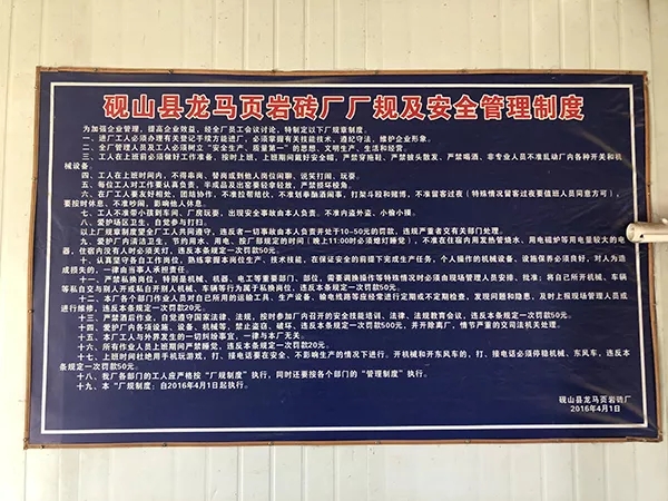 记者在现场看到,龙马页岩砖厂建在革豆村山洼里,它不像传统长排的砖窑,龙马砖厂的生产基地为圆形建筑,里面贴有安全制度管理规则和警示安全标。砖厂门口,4排临时搭建的小平房构成了许兴璠的办公室和工人的宿舍。办公室的桌子上,摆着该砖厂的营业执照、采矿证和云南省排放污染物许可证。