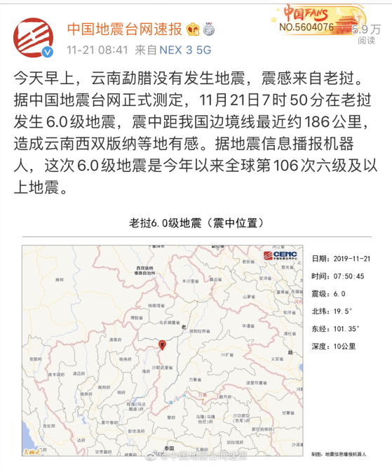 中国地震台网正式测定:11月21日07时50分在老挝(北纬19.50度,东经101.35度)发生6.0级地震,震源深度10千米。