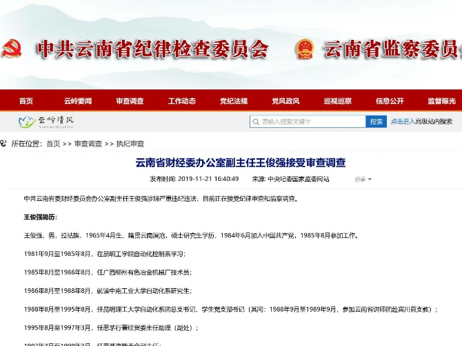 昆明信息港讯 机器人小明 中共云南省委财经委员会办公室副主任王俊强涉嫌严重违纪违法,目前正在接受纪律审查和监察调查。