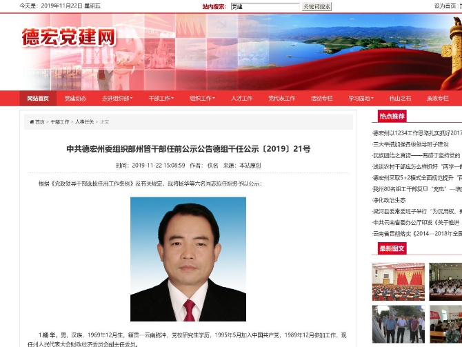 昆明信息港讯 机器人小明 11月22日,中共德宏州委组织部发布6名州管干部任前公示公告,其中杨 华拟提名为州人民代表大会财政经济委员会主任委员候选人,尚正宠拟任中国(云南)自由贸易试验区德宏片区党工委副书记、管委副主任(正处级)。详情如下: