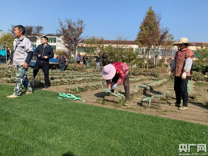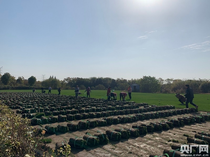 村民正在对草皮进行捆扎(央广网记者 孙冰洁 摄)