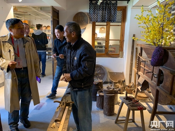 梅林村匠心铺内的本地工匠正向游客展示其所做的手工艺品(央广网记者 孙冰洁 摄)