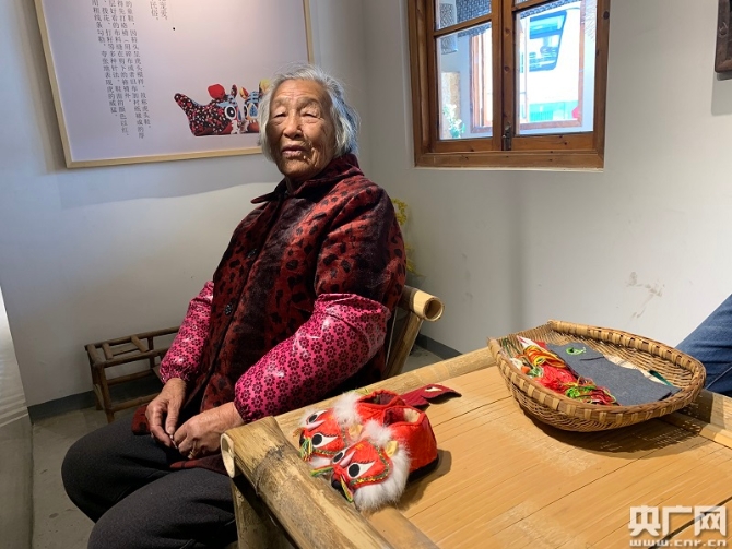 村民丁奶奶与其手工缝制的虎头鞋(央广网记者 孙冰洁 摄)
