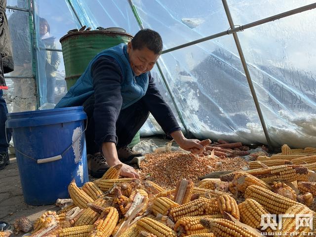 李秀珍收拾着从地里捡回来的玉米(央广网记者 王晶 摄)