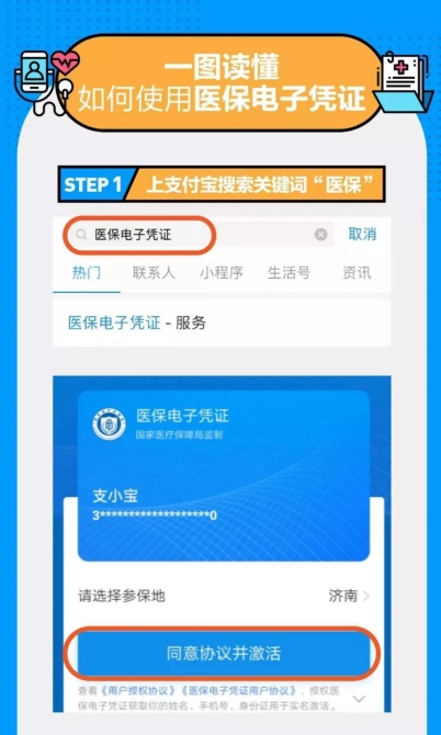 在支付宝首页搜索 " 医保电子凭证 ",同意领取并经过刷脸认证后,即可一键将凭证放入支付宝 " 卡包 ",今后刷手机就能轻松完成医保支付。目前使用该项服务,还能得到支付宝随机立减红包和蚂蚁森林能量。