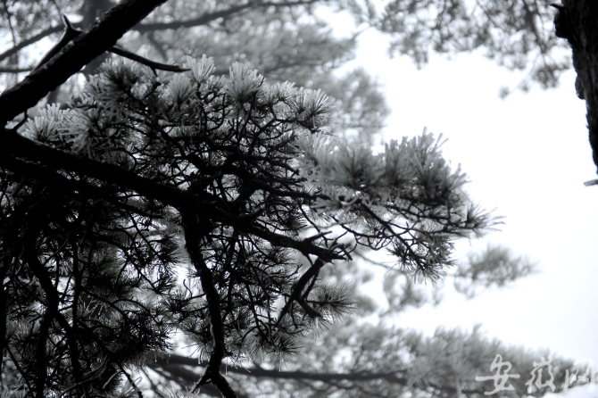 雨雾在冷空气的抚摸下,凝结成钟乳石般晶莹剔透的冰晶,紧紧包裹着黄山上的松、石、草、木,给它门穿上一层独属于冬天的外衣。整个黄山,在大自然奇特的馈赠下,犹如天上的珊瑚岛。造型奇特的松、遍地的灌木,都成为银花盛开的玉树;满枝满树的冰挂,风吹树动,冰挂撞击,发出叮当之声。