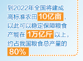 近日,国务院办公厅印发《关于切实加强高标准农田建设提升国家粮食安全保障能力的意见》(以下简称《意见》)。在11月25日国新办举行的国务院政策例行吹风会上,农业农村部副部长余欣荣表示,按照《意见》,到2022年全国将建成高标准农田10亿亩,以此可以稳定保障粮食产能在1万亿斤以上,约占我国粮食总产量的80%。