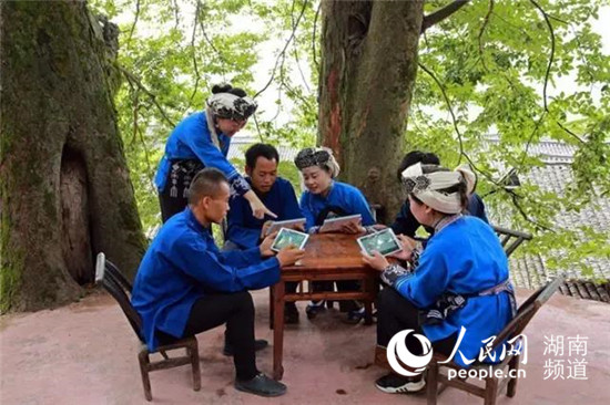 湘西电大副校长龙晓颖(左二)指导农民大学生利用学习PAD进行小组学习。湖南广播电视大学供图