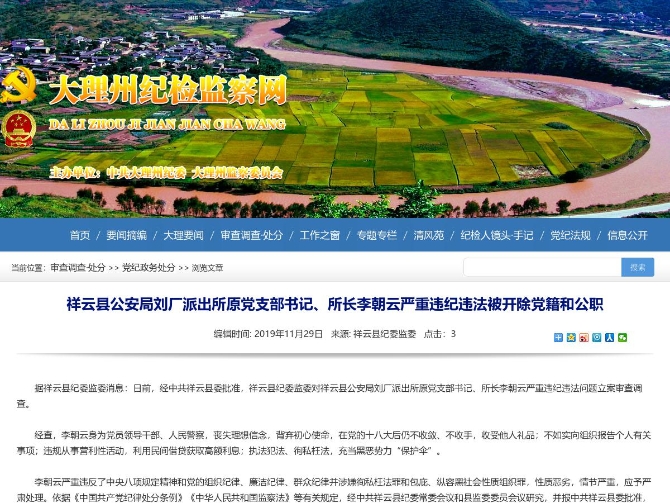 李朝云严重违反了中央八项规定精神和党的组织纪律、廉洁纪律、群众纪律并涉嫌徇私枉法罪和包庇、纵容黑社会性质组织罪,性质恶劣,情节严重,应予严肃处理。依据《中国共产党纪律处分条例》《中华人民共和国监察法》等有关规定,经中共祥云县纪委常委会议和县监委委员会议研究,并报中共祥云县委批准,决定给予李朝云开除党籍、开除公职处分,其涉嫌犯罪问题移送检察机关依法审查起诉。