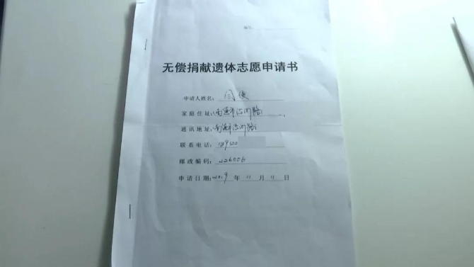 今年11月11日,闫老在市红十字会书面登记,成为遗体、眼角膜捐献志愿者。对于老人要捐献遗体的想法,起初家人并不太理解,但经过深入沟通,都表示了支持。