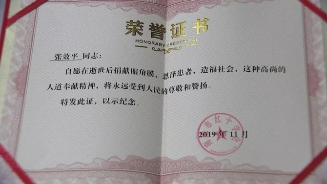 仪式结束后,市红十字会工作人员将遗体捐献荣誉证书颁发给老人的亲属。张雷说,受父亲的榜样影响,他也准备办理遗体捐献登记手续。