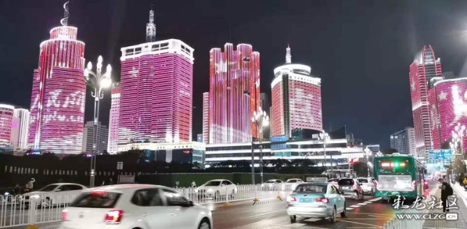 鲜艳的五星红旗投影在成片的大楼上,太壮观了。