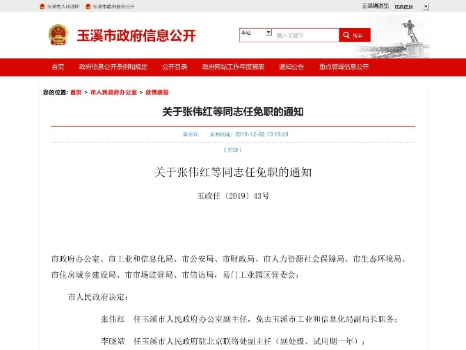 张伟红 任玉溪市人民政府办公室副主任,免去玉溪市工业和信息化局副局长职务;