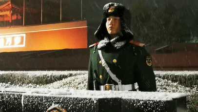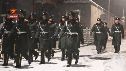 纷纷扬扬的雪花见证了他们忠于职守的姿态似乎也在向他们告别“再见,老兵!”