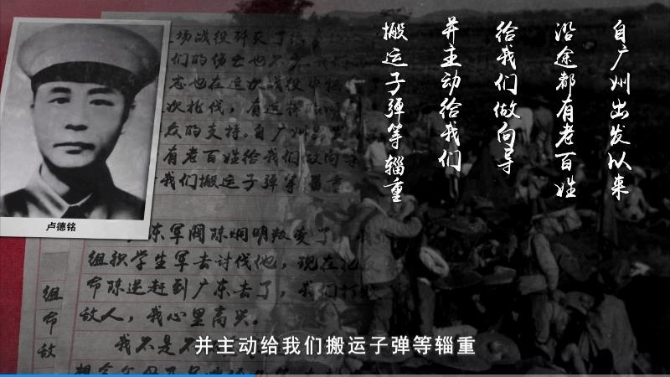 “这场战役歼灭了很多敌人,但是我们的伤亡也不少。我们的营长曹渊同志也在这次战役中牺牲了。我们这次北伐,有这样的顺利进军,全靠群众的支持。自广州出发以来,沿途都有老百姓给我们做向导,并主动给我们搬运子弹等辎重。”