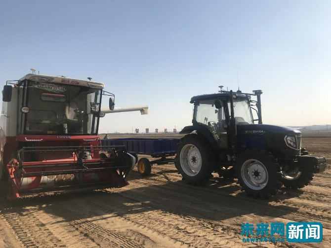 无人驾驶收获机和无人驾驶运粮车。(未来网记者 谢青摄)