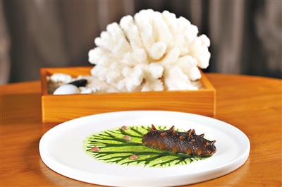 海参是另一道代表作。在上菜前,餐厅中扬起海浪拍打礁石之声,海涛声中,一件大贝壳被送到了食客餐桌前,里头藏着一只未发制的干货小海参,食客可以触摸海参,感受它的质感。当这一切完成后,真正的能被品尝的菜才登场,这是一个连贯而立体式的饮食美学体验。